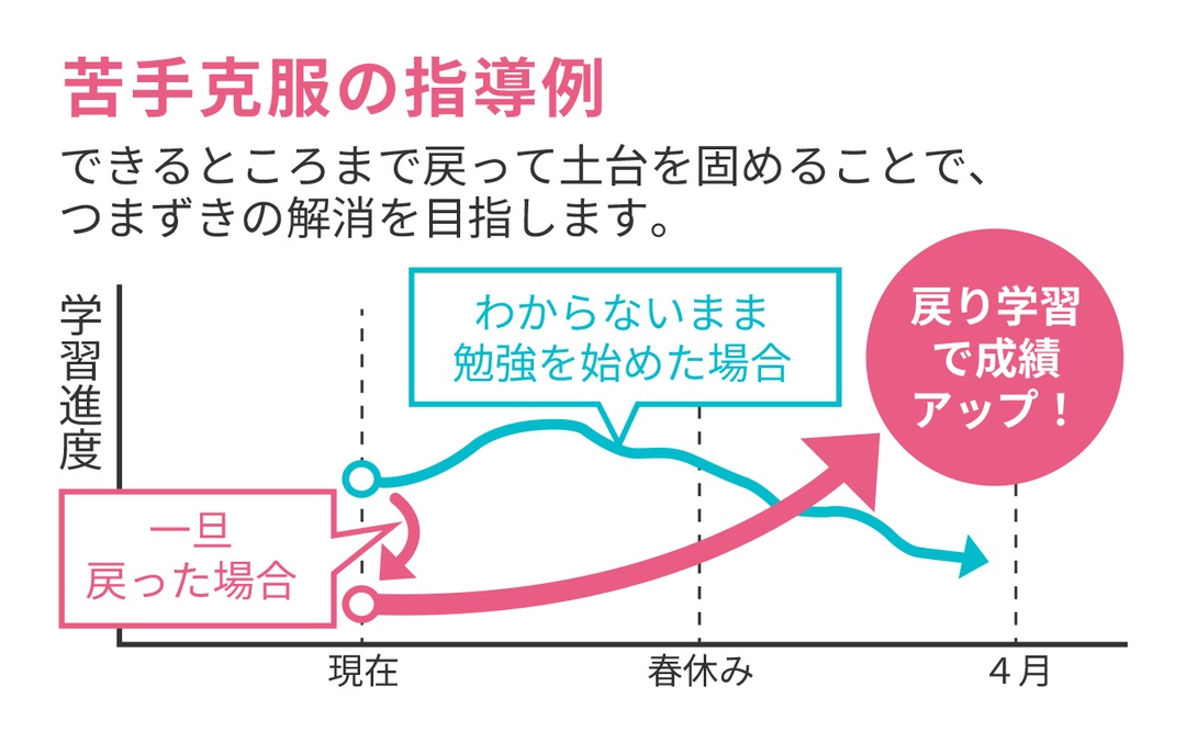 苦手な科目や単元は、学年の枠を外してつまずく前の「できるところまで戻る」さかのぼり学習をします。できるからやる気が出て、丁寧にスモールステップを積み重ねることで「できた」の自信を育てます。