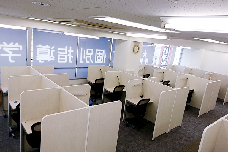 教室の入口はこちらです。エレベーターを6階で下りてすぐに教室があります。 教室で何かわからないことがあれば、受付カウンターまでお気軽にご相談ください。 集中しやすいようパーテーションで区切られた授業ブースで「1:1」と「1:2」から授業をお選びいただけます。 こちらは自習ブースです。月~土の14:00~21:30で使用できます(講習期間の利用時間は変動します)。 自習席は1人ひとり区切られた設計。しっかりと自分の勉強に集中できます! こちらが面談室です。年数回の面談を実施。進路や学習方法について定期的にご提案しています。 各種進路資料をご用意し、丁寧にご相談・提案を行っております。