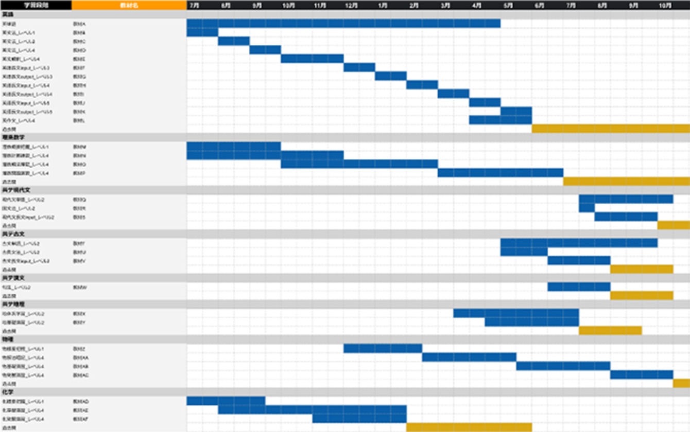 志望の難関大の学力試験で課される、全教科・科目に対応し、必要な科目分の学習計画をプランニング、学習進捗管理を行います。